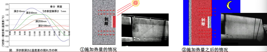① 白天、針對(duì)水泥外部施加熱量的話,與健全部位相比較的剝離部位熱容量小、容易更快發(fā)熱。